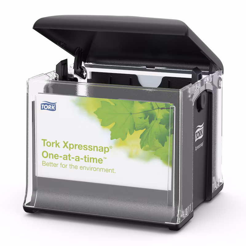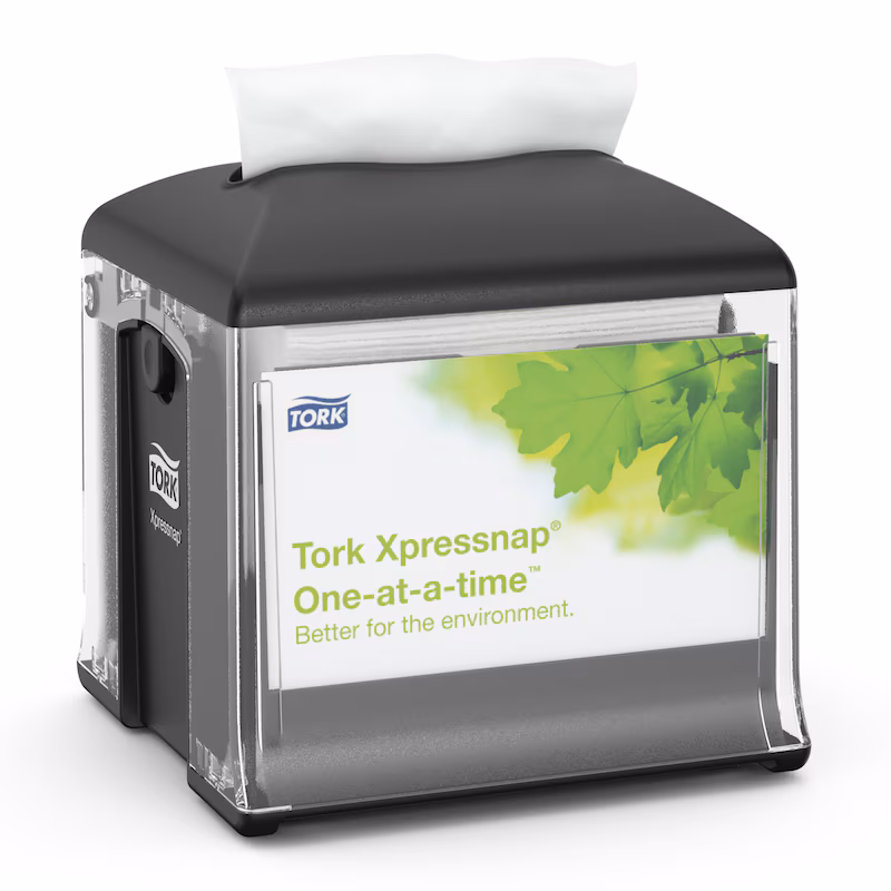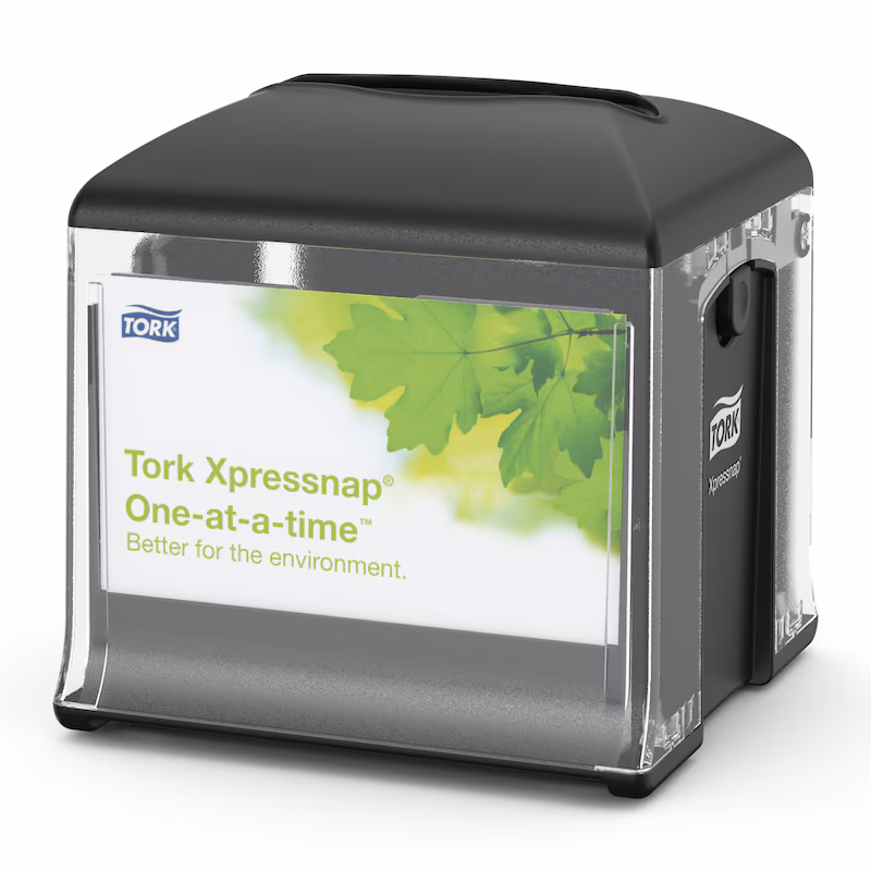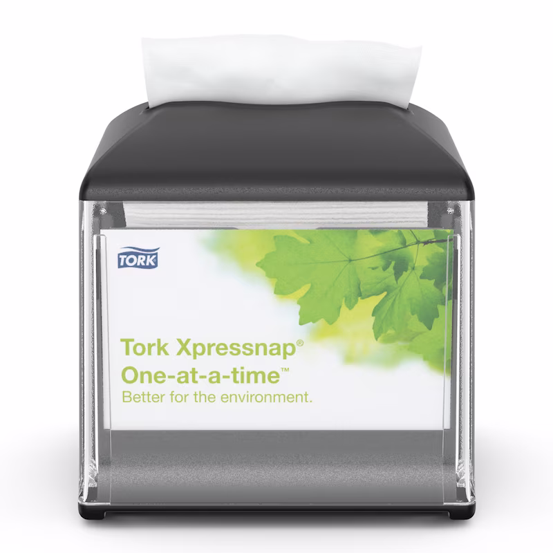 Tork Xpressnap Snack© Peçete Dispenseri, küçük peçetelerin tercih edildiği sınırlı servis restoranları için idealdir. Bu kompakt dispenser peçeteleri her seferinde tek tek vererek, hijyeni artırır ve geleneksel dispenserli peçete sistemlerine kıyasla tüketimi %25'e varan oranda azaltır.